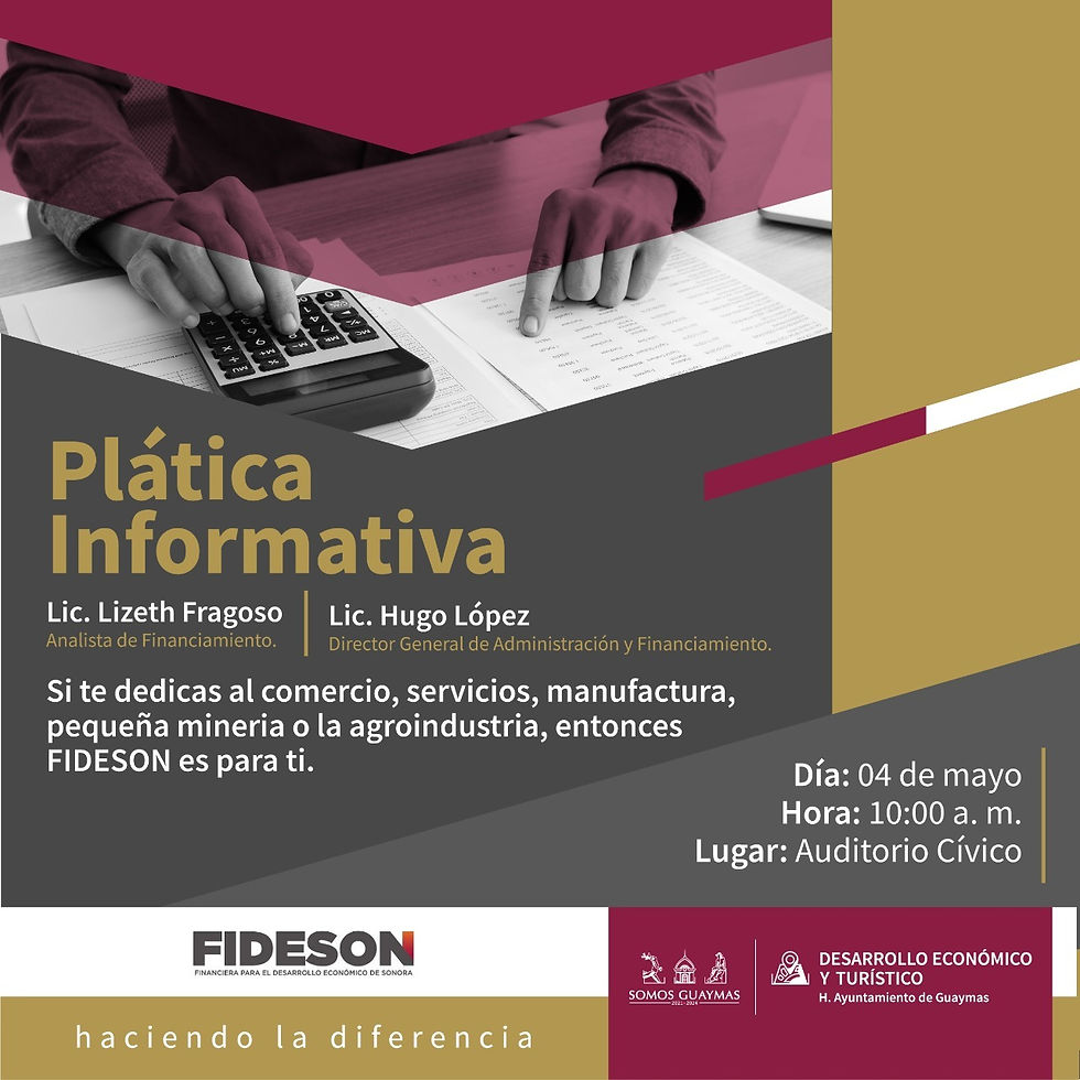 Guaymas, Sonora, 02 de mayo de 2022.- A través de personal de la Financiera para el Desarrollo Económico de Sonora (FIDESON), este próximo 4 de mayo se impartirá plática informativa, anunció el director de Desarrollo Económico y Turístico, Jorge Medina Lizárraga.